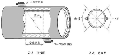 DN200~6000mm的管道優先選用Z法,在V法測不到信號或信號質量差時也可選用Z法。安裝時讓兩個傳感器之間沿管軸方向的垂直距離等于安裝距離,并且保證兩個傳感器在同一軸面上即可,并注意發射方向一定相對(兩個傳感器方向朝里)。由于Z法是超聲波在介質傳播中直接收發,信號沒有反射,因而信號強度衰減最小。所以,Z法信號強度較高,適用于口徑較大、介質含雜質或氣泡、管道有結垢等超聲波信號衰減較大的場合