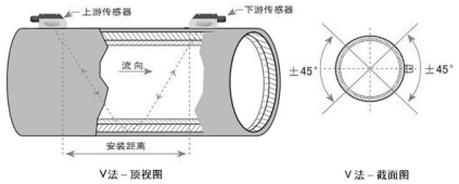 DN15~200mm的管道優先選用V法,安裝時兩傳感器水平對齊,其中心線與管道軸線平行即可,并注意發射方向一定相對(兩個傳感器方向朝里)。V法具有使用方便,測量準確的特點。對于口徑小于DN50mm的管道安裝精度較高,請注意信號強度、信號質量、傳輸時間比這幾個參數。