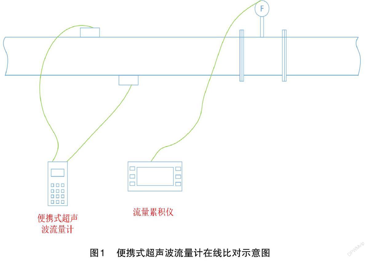 實際工作中,多為用經過檢定合格的便攜式超聲波流量計(標準表)與現場流量計進行串聯,記錄標準表和現場流量計的瞬時流量、累計流量,從而進行在線比對校準,具體見圖1。常見介質為生產水、生活水、循環水、污水、壓縮空氣等。